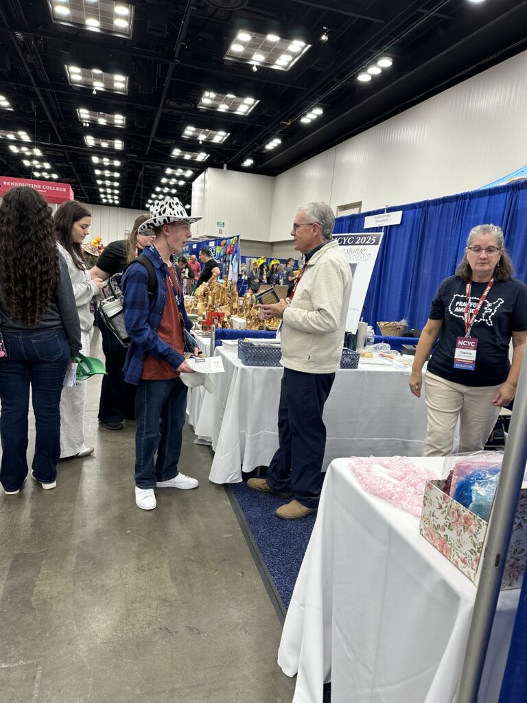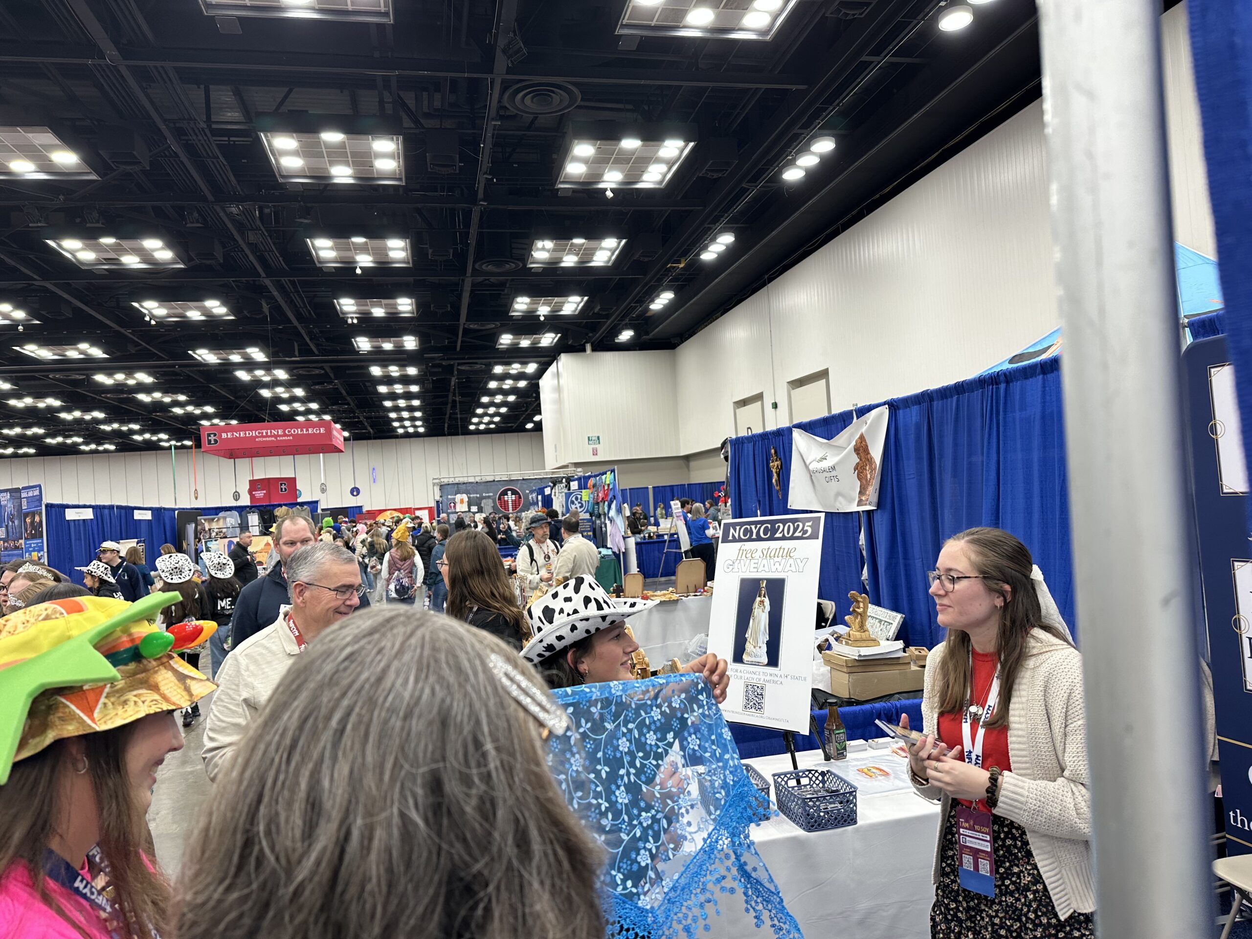 We at Our Lady Patroness of America Center couldn’t resist joining in the fun, especially so close to home. We had a small booth to help America’s youth learn about their patroness, Our Lady of America. There were over 150 other exhibitors who came to share their ministries, their colleges, their cool Catholic clothing lines, their jewelry and art, their vocational guidance, their service projects, and even their fun games; each one desiring one thing, to help youth live their faith out loud. We had great conversations with young people, their youth ministers, and their pastors. We met people from Hawaii, Kansas, Oklahoma, Montana, Florida, Iowa, California, and New York just to name a few. We sold out of chapel veils, and we had hundreds register to be part of our giveaway, with one lucky winner taking home a 14” statue of Our Lady of America. Many passing our booth remarked how beautiful she was, and were encouraged by her messages.