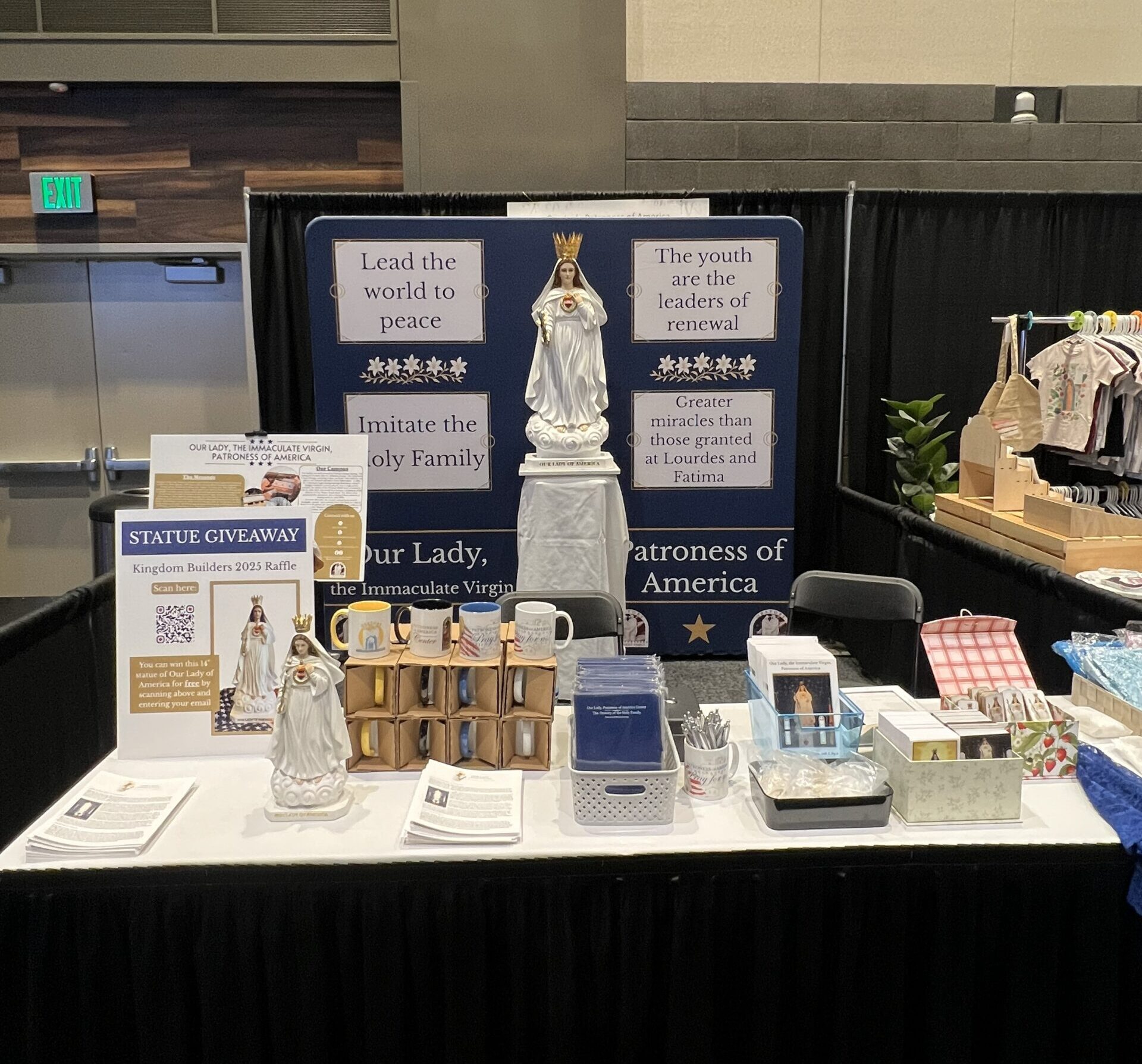 We at Our Lady Patroness of America Center couldn’t resist joining in the fun, especially so close to home. We had a small booth to help America’s youth learn about their patroness, Our Lady of America. There were over 150 other exhibitors who came to share their ministries, their colleges, their cool Catholic clothing lines, their jewelry and art, their vocational guidance, their service projects, and even their fun games; each one desiring one thing, to help youth live their faith out loud. We had great conversations with young people, their youth ministers, and their pastors. We met people from Hawaii, Kansas, Oklahoma, Montana, Florida, Iowa, California, and New York just to name a few. We sold out of chapel veils, and we had hundreds register to be part of our giveaway, with one lucky winner taking home a 14” statue of Our Lady of America. Many passing our booth remarked how beautiful she was, and were encouraged by her messages.