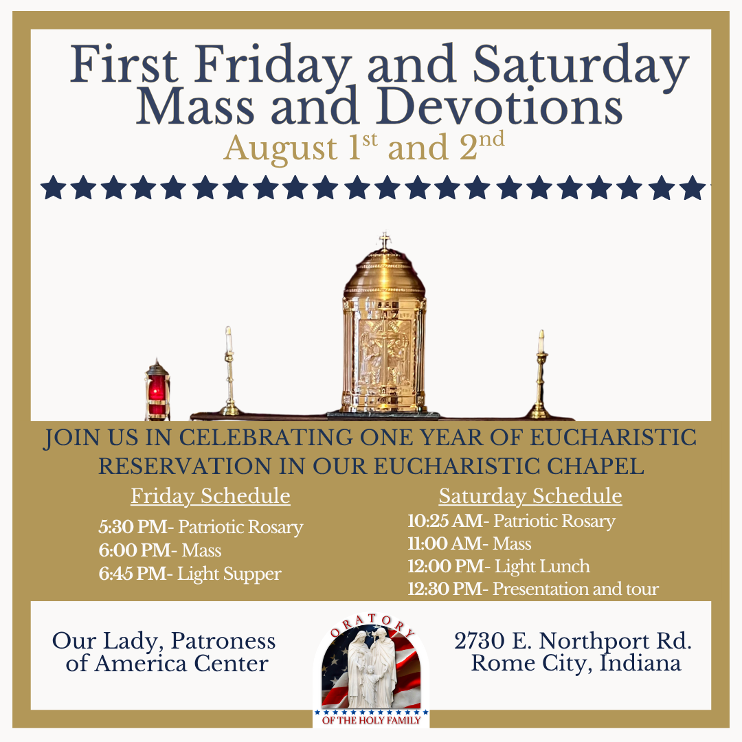 Join us for First Friday Mass celebrated by Father Patrick Hake! The Holy Sacrifice of the Mass will be offered at 6 pm on the first Friday of August in the Oratory of the Holy Family in reparation for offenses against the Sacred Heart of Jesus. The Patriotic Rosary will be prayed at 5:30 pm before Mass begins. A free meal will be served after the Mass is over so that pilgrims can enjoy our campus and fellowship together.