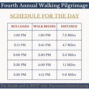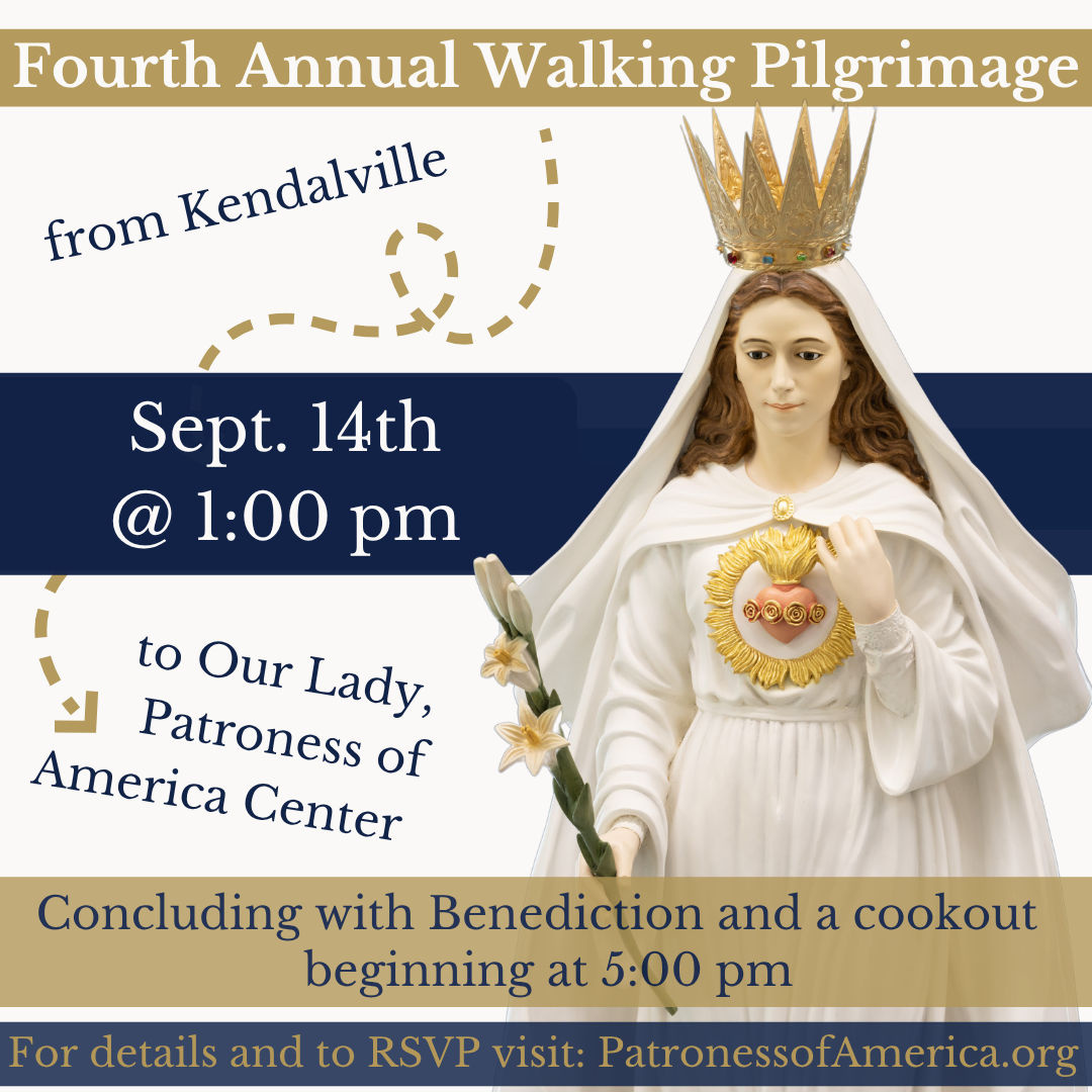 Join us on September 14th for the Fourth Annual Walking Pilgrimage in celebration of the 69th anniversary of the devotion to Our Lady of America. We will walk along Fishingline Trail from Kendallville to Our Lady, Patroness of America Center in Rome City, with varying starting points and times based on the distance you want to walk. Following the walk, there will be a time of Adoration and Benediction, with dinner and fellowship on the plaza afterwards. For full details visit: 4th Annual Pilgrim Walk to Celebrate Anniversary of the Devotion – Our Lady Patroness of America Center