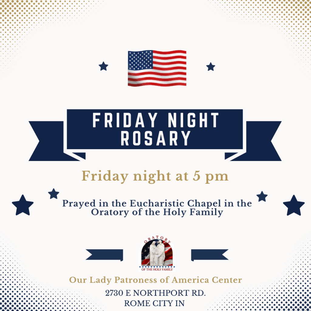 Beginning April 25th, every Friday (*except First Friday) evening at 5 pm, we gather to pray the Holy Rosary. We typically pray all 20 mysteries of the Rosary. If you can only stay for a few minutes, leaving whenever needed is okay. We will be praying the Rosary in the Eucharistic chapel within the Oratory of the Holy Family.